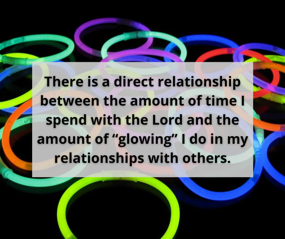 I know this is definitely true in my life. Almost without fail, if I start to notice that impatience or anger are getting the best of me or I’m starting to become overly depressed or worried, I will recognize that I also am not prioritizing my time with the Lord during that period of time. Usually, the times when my spiritual “fruit” is not looking very tasty coincide with the periods when I am not abiding in Christ. There is a direct relationship between the amount of time I spend with the Lord and the amount of “glowing” I do in my relationships with others.